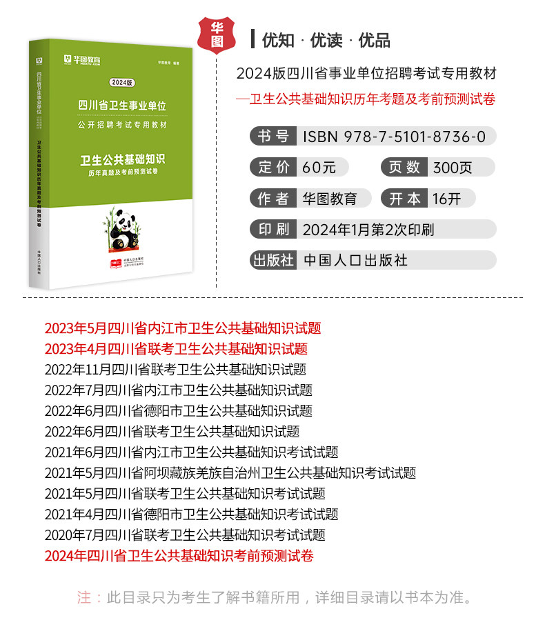 【华图图书】为您提供2024版四川省卫生事业单位招聘考试【卫生公共基础知识】历年+预测 1本,更多最新四川医疗卫生图书考试网校课程及视频请关注华图图书!